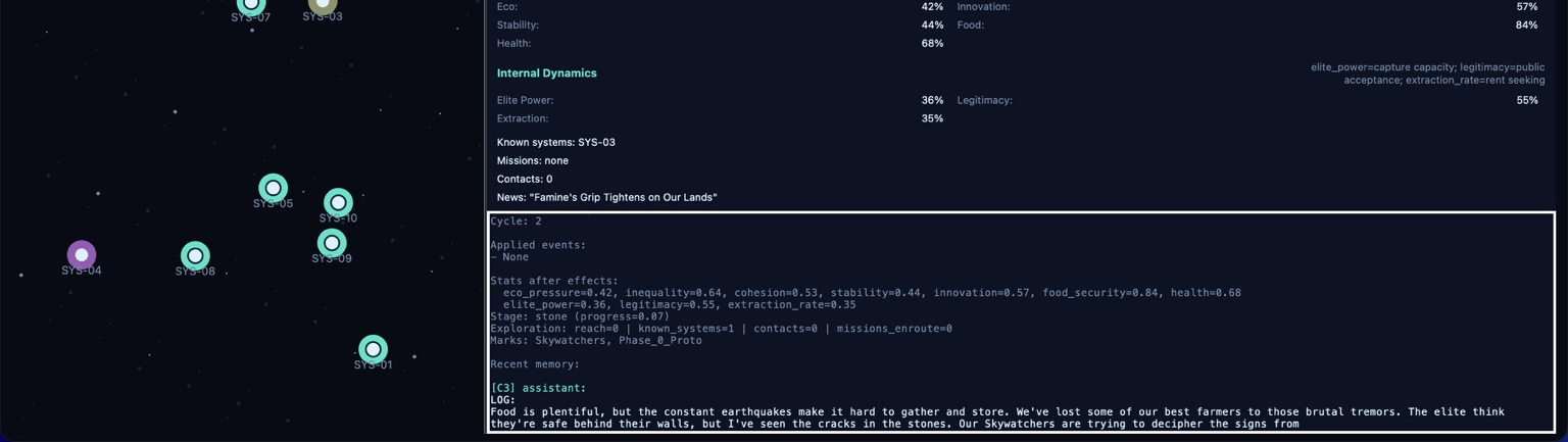 The system stopped trying to make everything more efficient, of course; he was not allowed to do so. Then it began behaving differently. My small in-silico civilizations no longer depicted the world as it was but as they believed it to be, or more, as they experienced it. Even when nothing significant occurred, no events, no collapses, no breakthroughs, the narrative LLM never went quiet. Hey, LLM was designed to talk. Memory, fear, and scars filled in the gaps. The LLM wasn’t simulating reality; it was simulating what could be in the minds of the civilization (more or less successfully).
